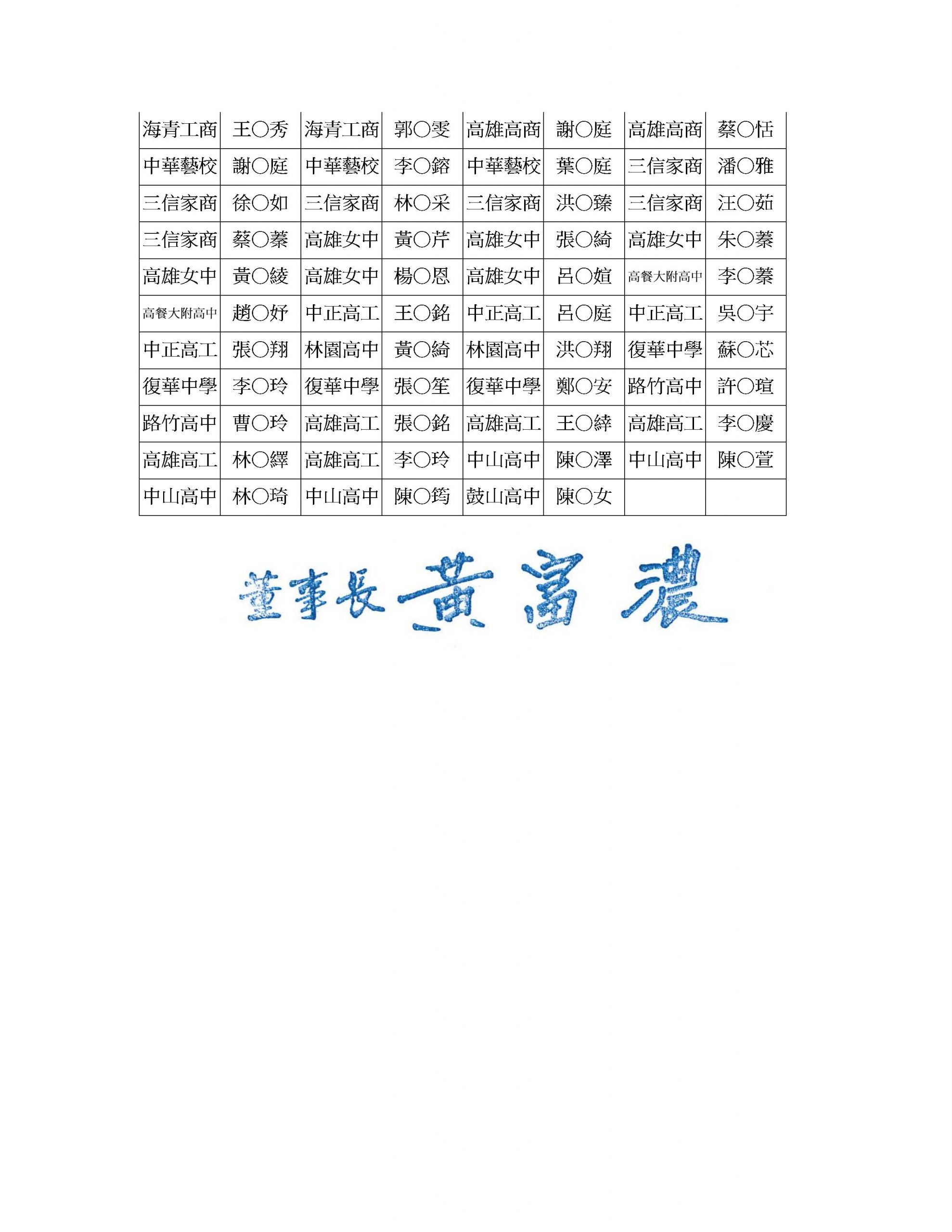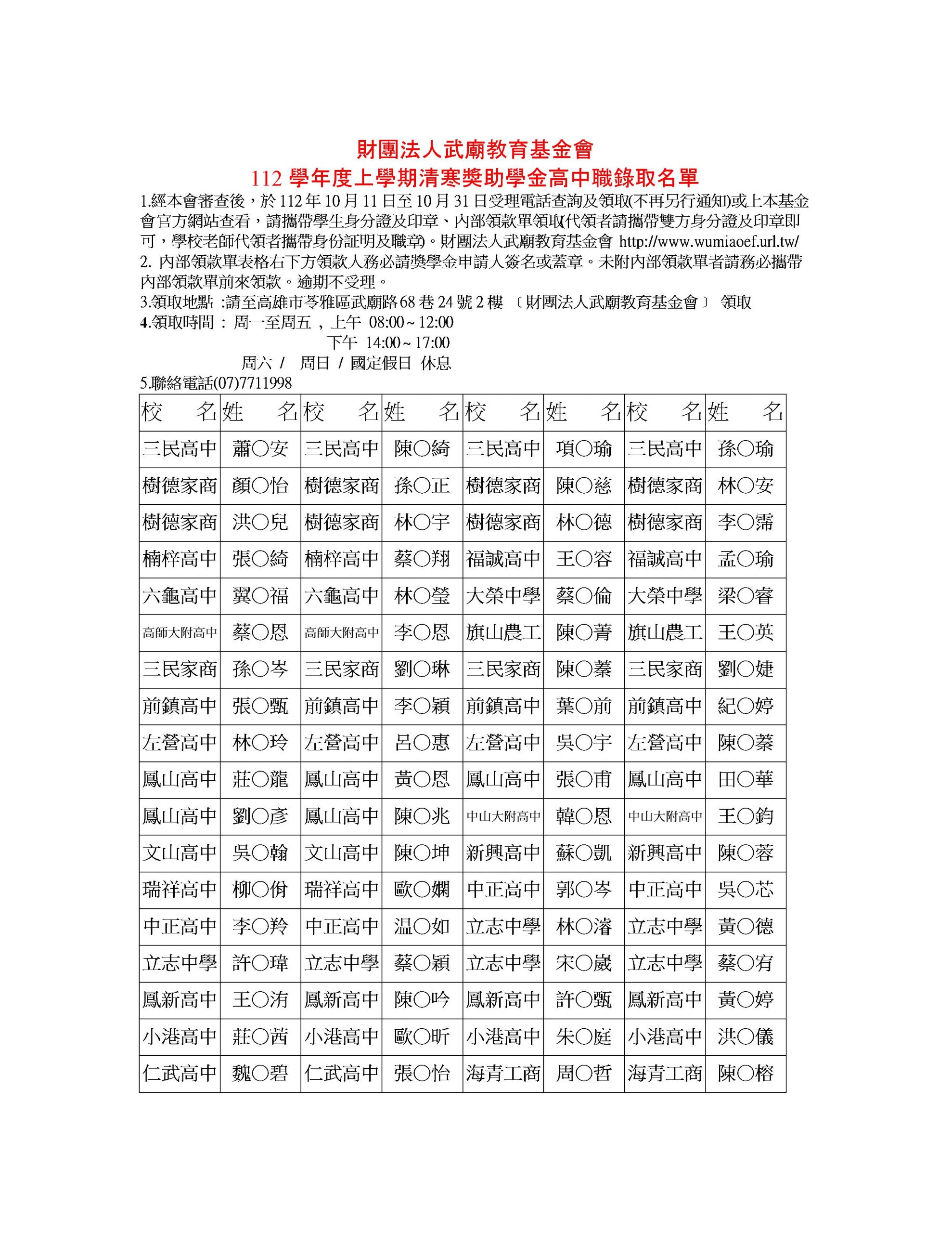 2023.10.06 本會112學年度上學期獎助學金高中職錄取名單公告10/11開始領取