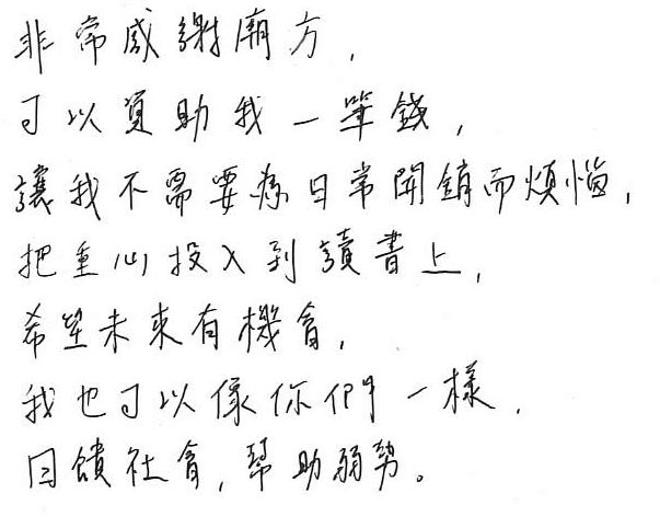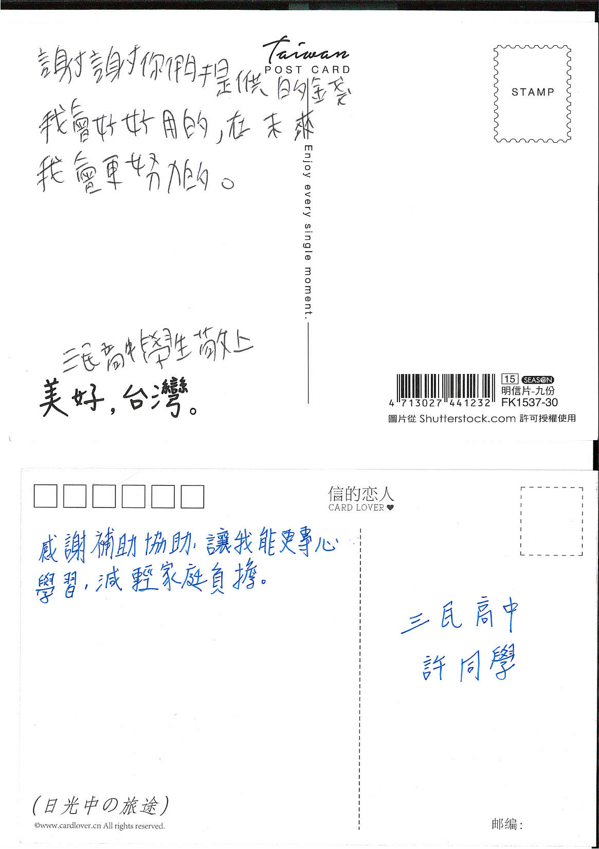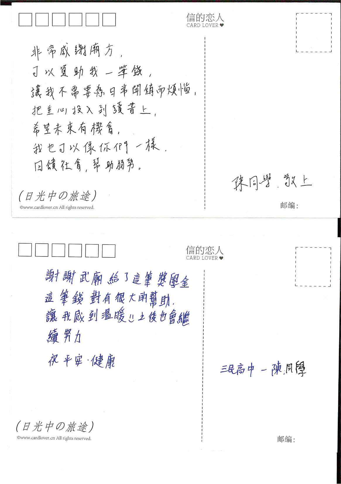 瀏覽人次: 36 高雄市三民高中的學生在領了武廟基金會的獎助學金後,自動自發寫了卡片感謝本會的贊助,信中說明會珍惜這筆獎學金,好好利用不會亂花錢,隻字片語 ,小小心靈能懂得表達感恩的心,實屬可貴。 武廟基金會的首要宗旨,即是「百年樹人」幫助清寒學子努力向上,每年分上下兩個學期,舉辦關聖帝君清寒獎助學金的發給,盡社會一點棉薄之力。今年114學年度上學期有401位同學領取,本會也希望藉此拋磚引玉,激發更多的善舉。 文章導覽 2025.10.15 本會114年度9月份捐贈人名冊公告2025.11.03 高復華中學學生給武廟基金會的感謝信 句句發自肺腑