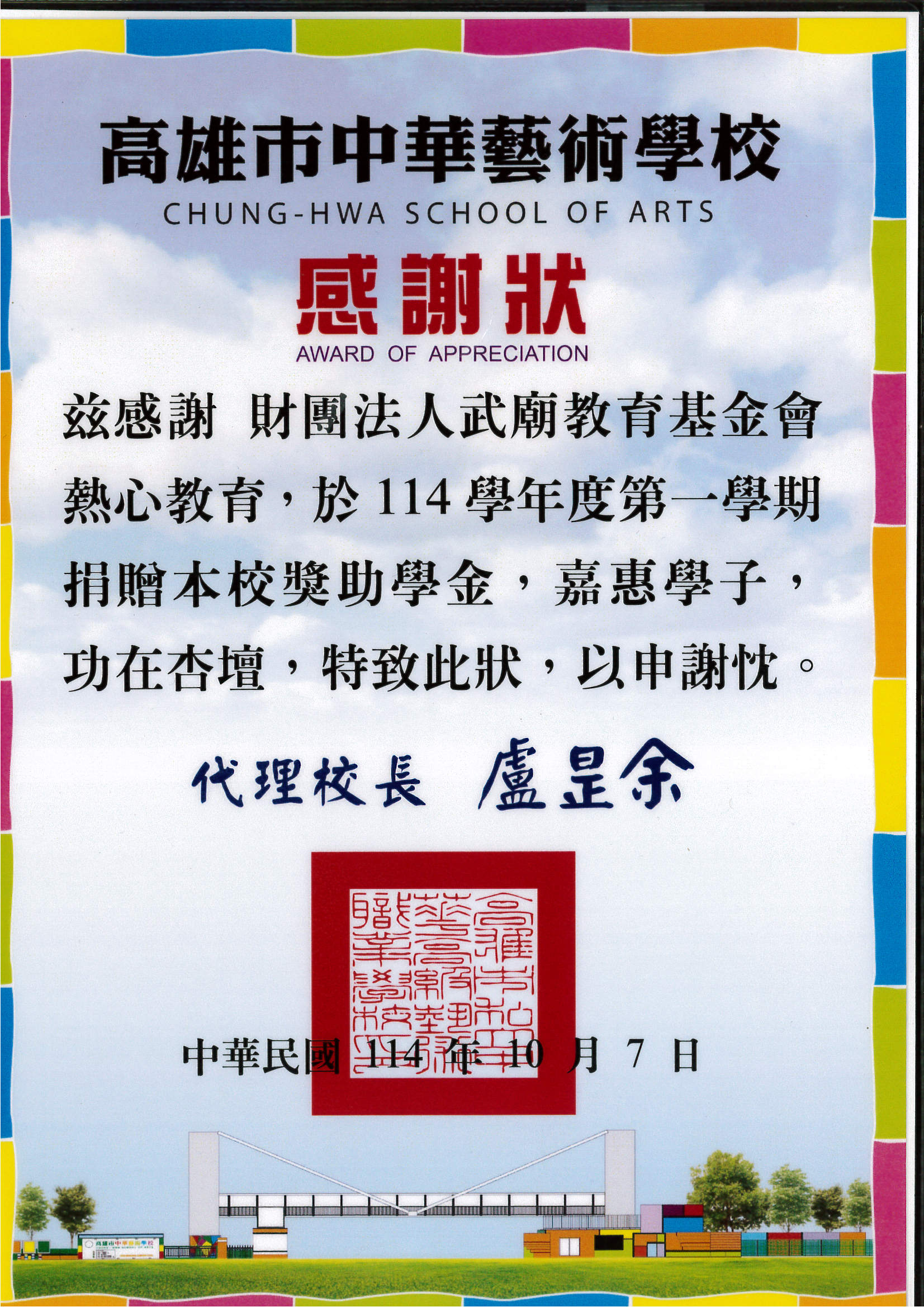 2025.11.03 「嘉惠學子 功在杏壇」中華藝校給武基會的感謝狀