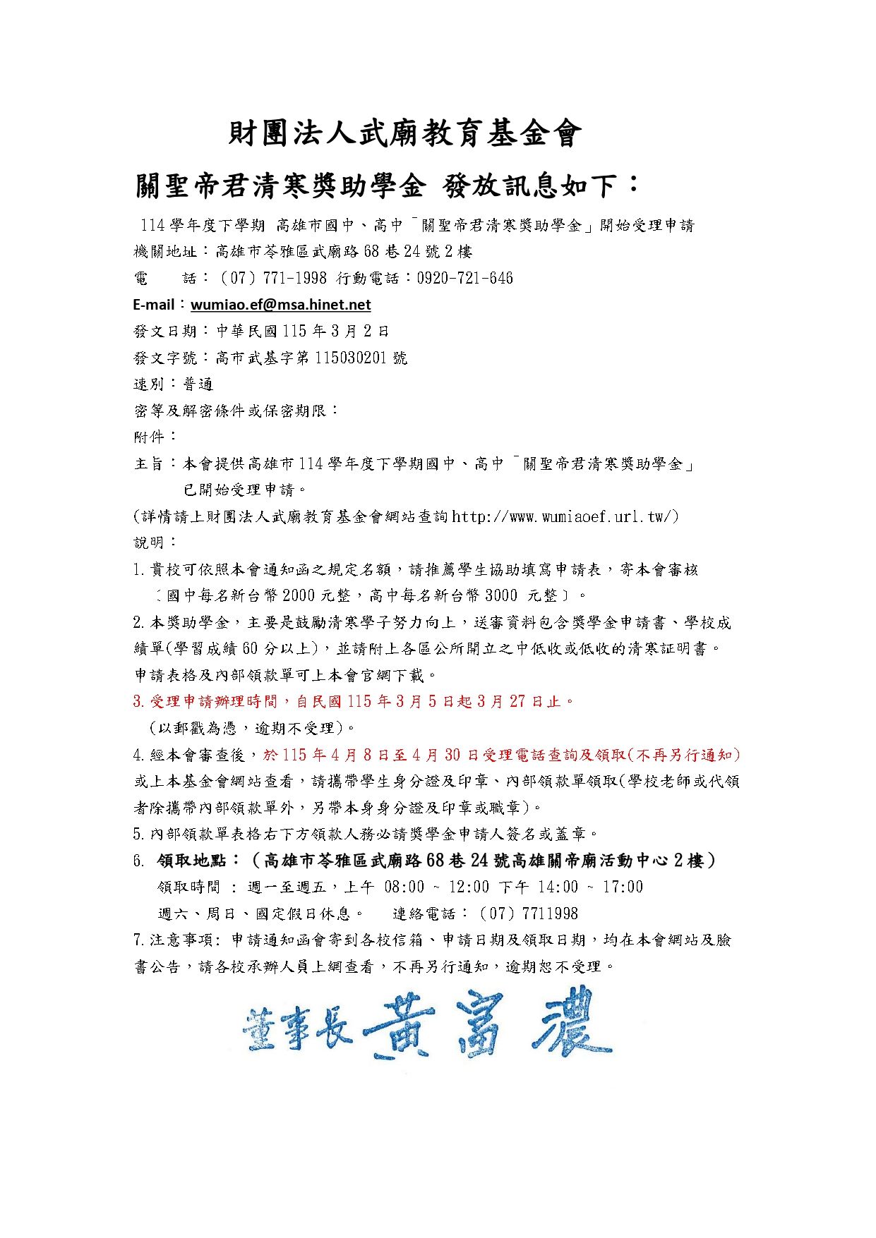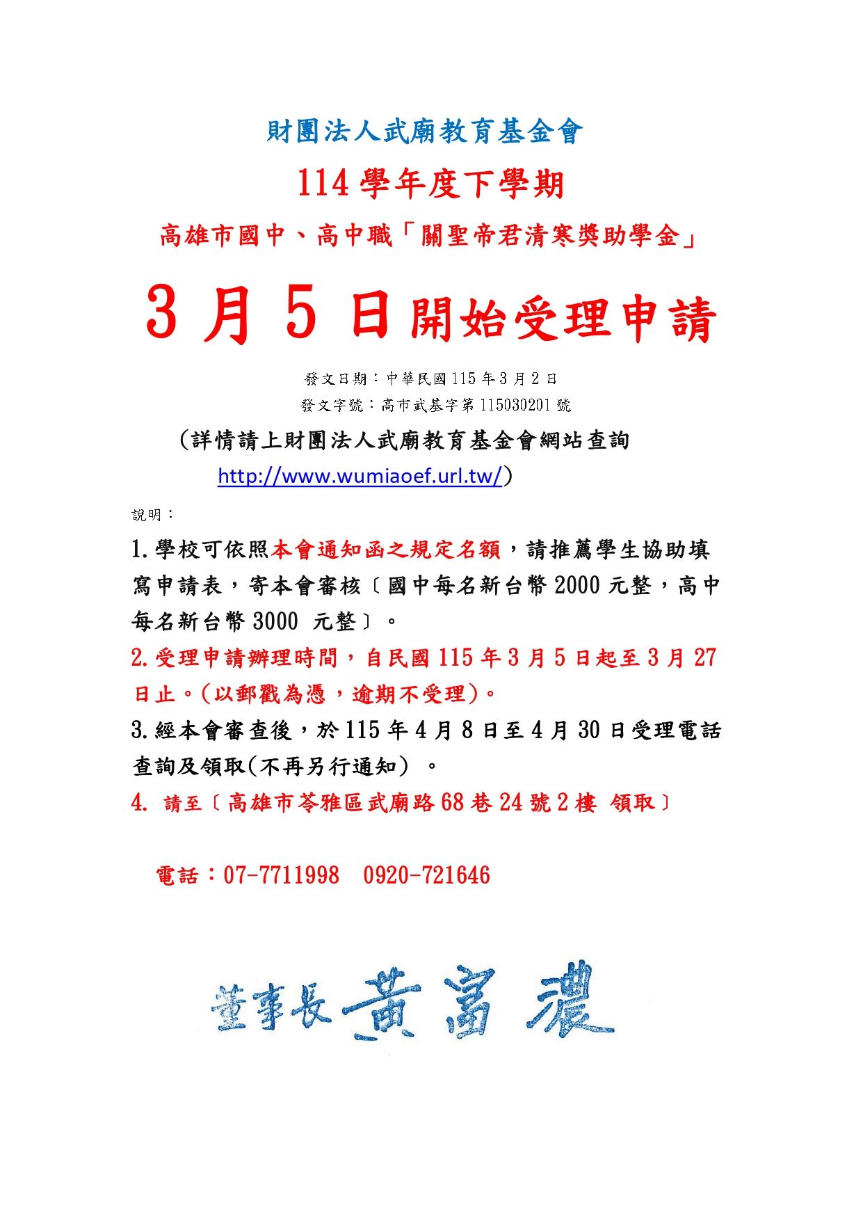2026.04.07 武廟教育基金會114學年度(下)清寒獎助學金國中 4/8開始領取