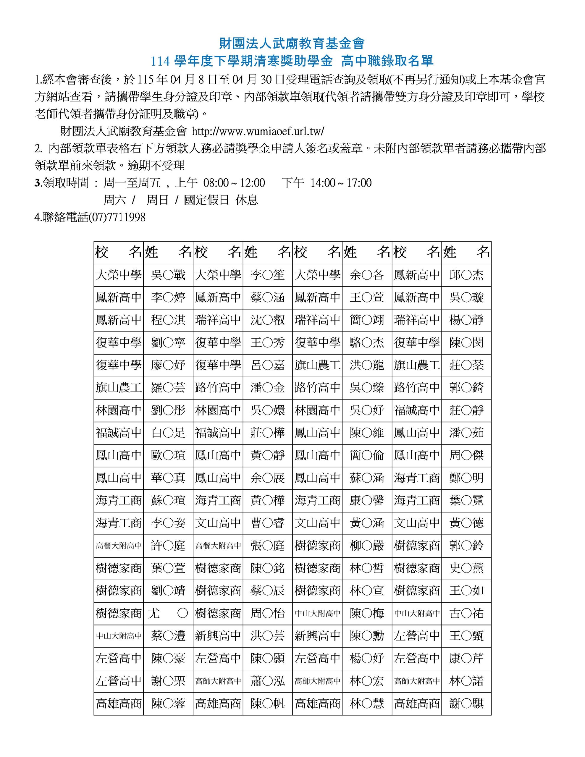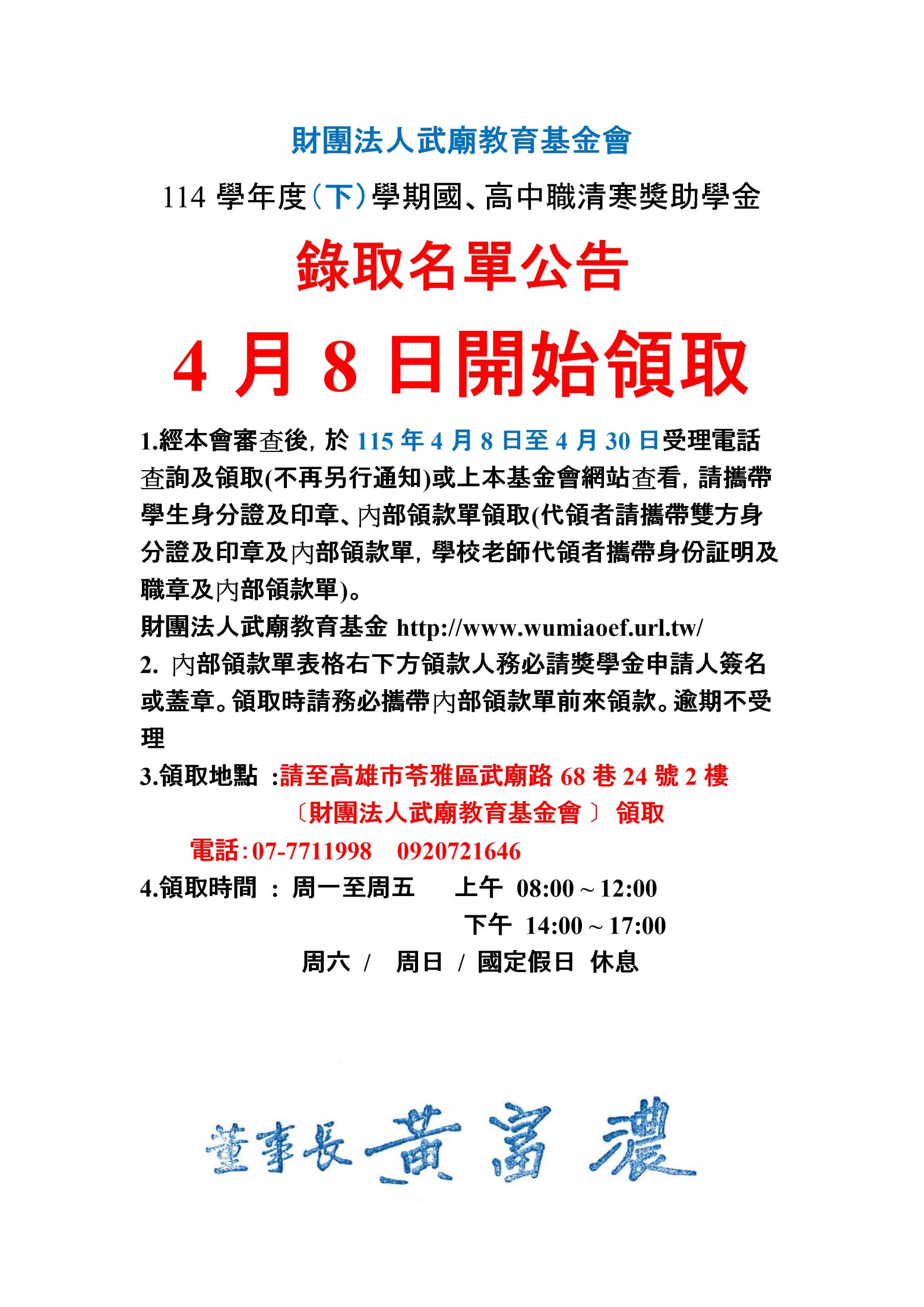 2026.04.07 武廟教育基金會114學年度(下)清寒獎助學金高中職 4/8開始領取
