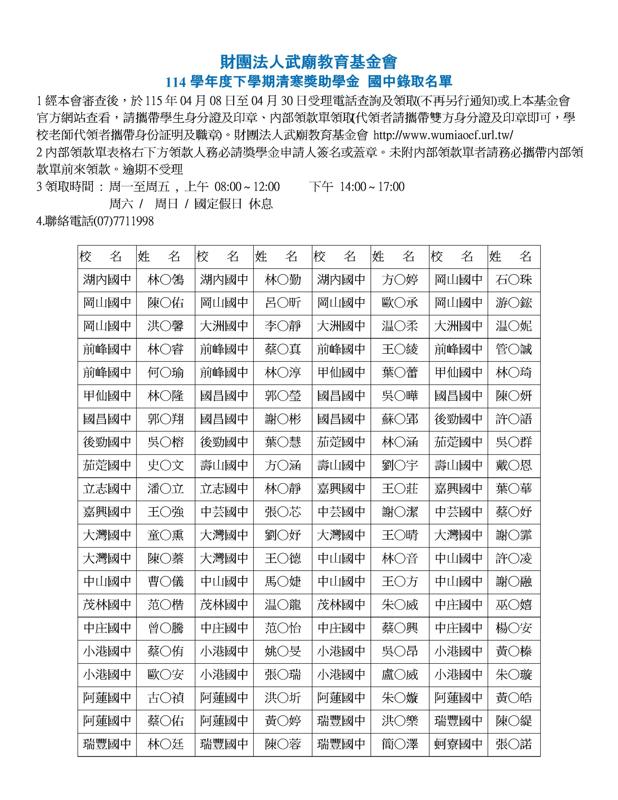 2026.04.07 武廟教育基金會114學年度(下)清寒獎助學金國中 4/8開始領取