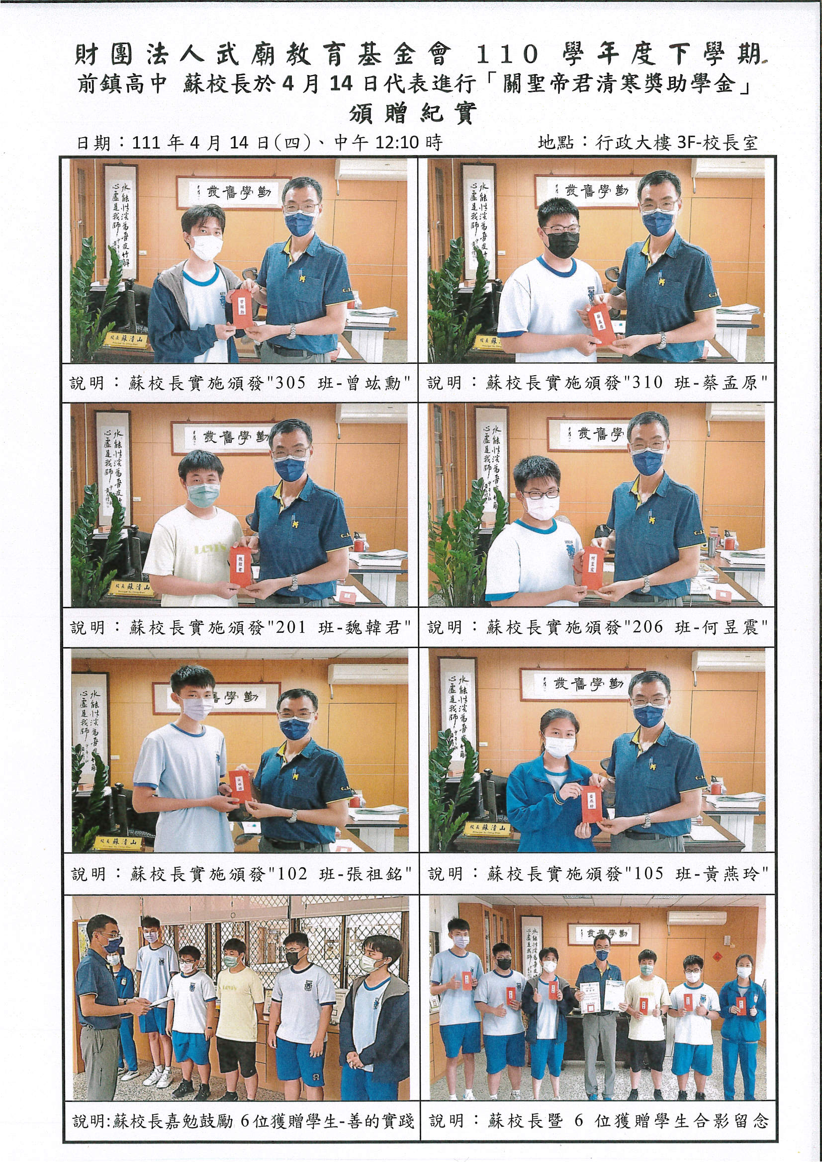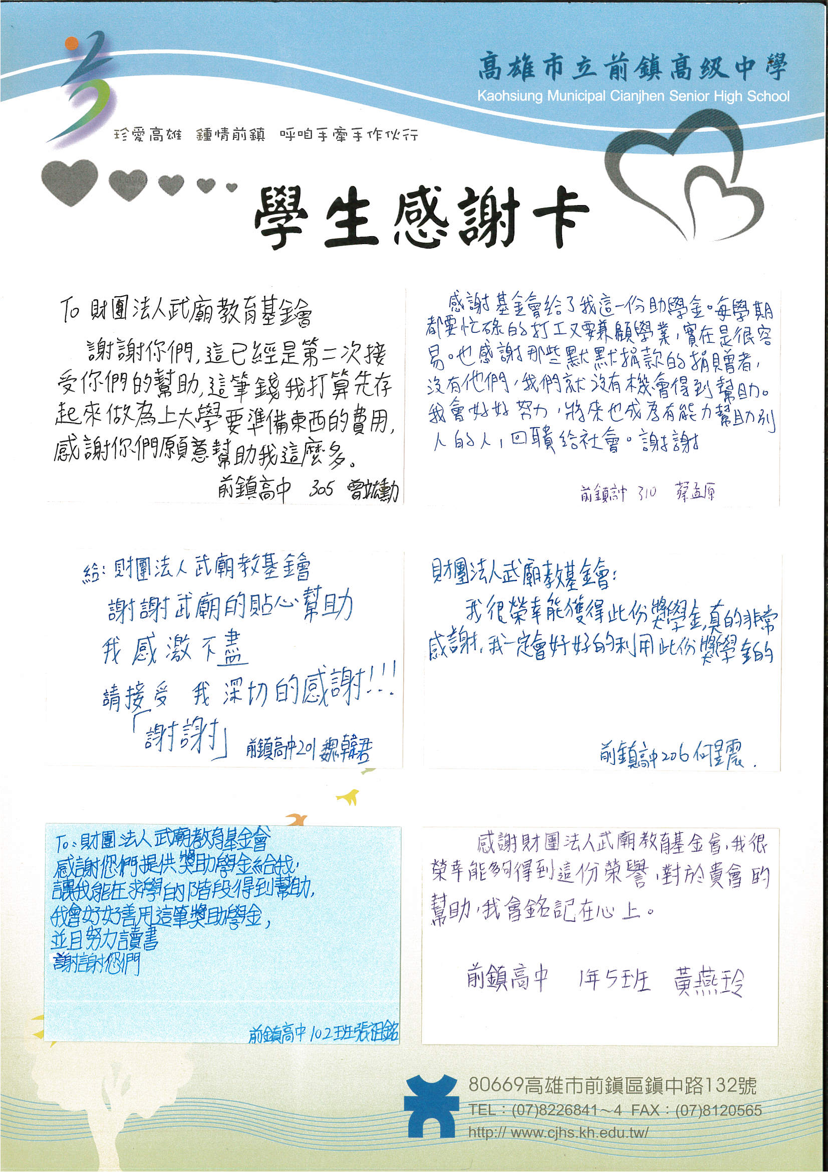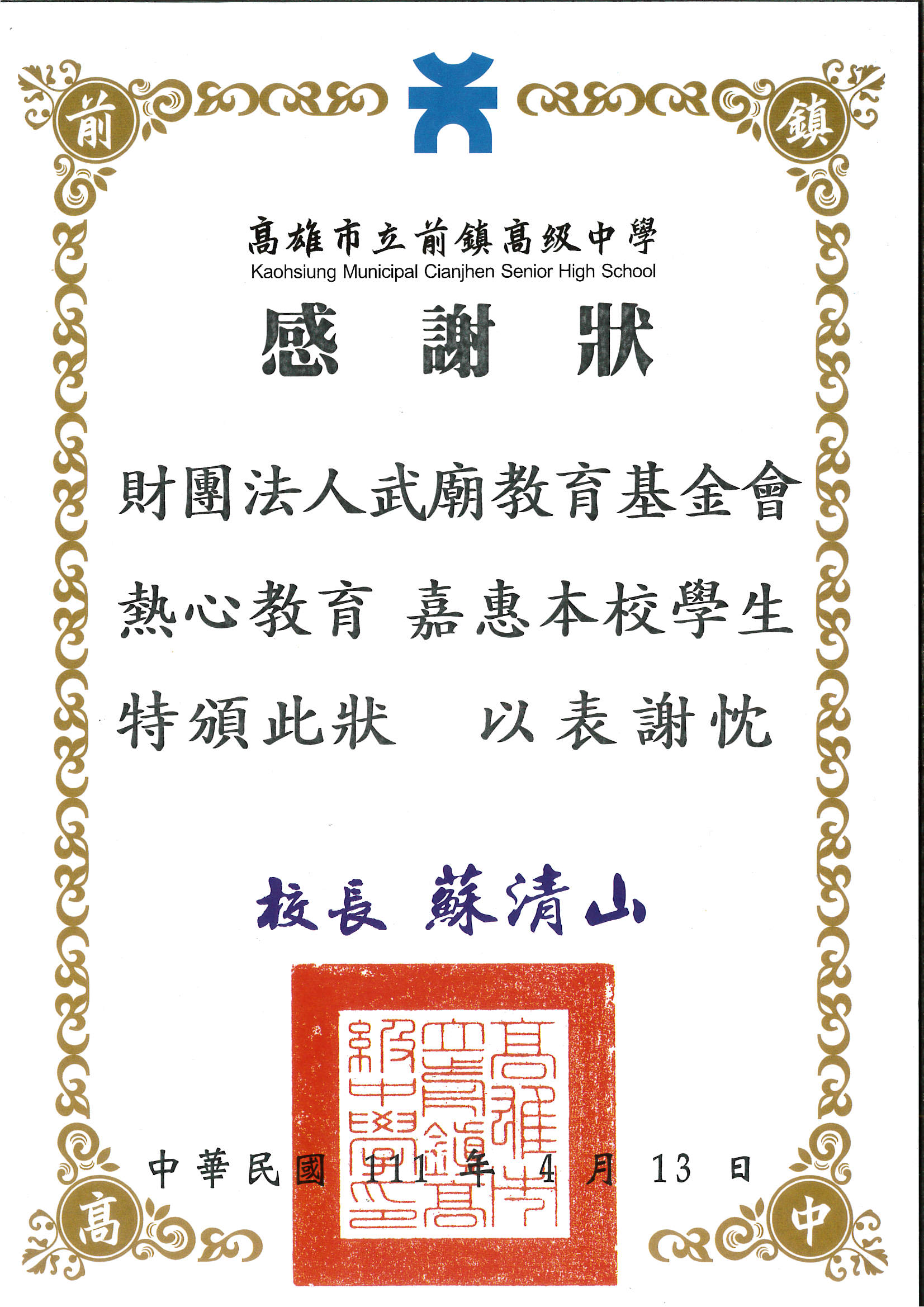 瀏覽人次: 375 前鎮高中頒感謝狀給武廟教育基金會 財團法人武廟教育基金會110學年度下學期清寒獎助學金已經全部發給完畢,前鎮高中校長蘇清山為表示感謝,除了製作學校感謝狀之外,還特別帶六位得獎學生合影,並舉行簡單的代頒儀式,同時也請學生寫感謝卡寄給武廟教育基金會,這項舉動讓人窩心。 文章導覽 2022.04.22 一張張小卡片 乘載無數感恩的心2022.04.27 復華高中學生寄小卡片給基金會,表達感謝之意